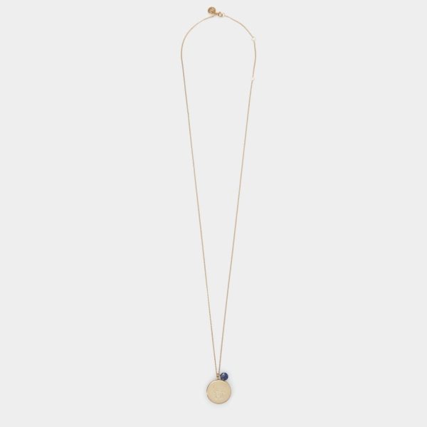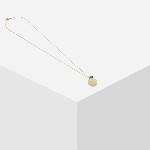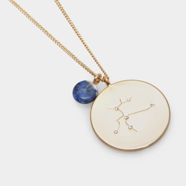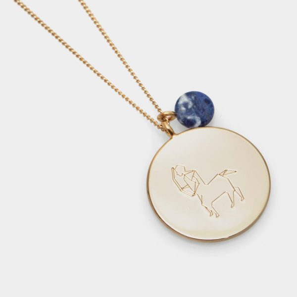 Collar fino bañado en oro con colgante grabado con símbolo y constelación Sagitario. Detalle de incrustación de cristales y colgante de sodalita.