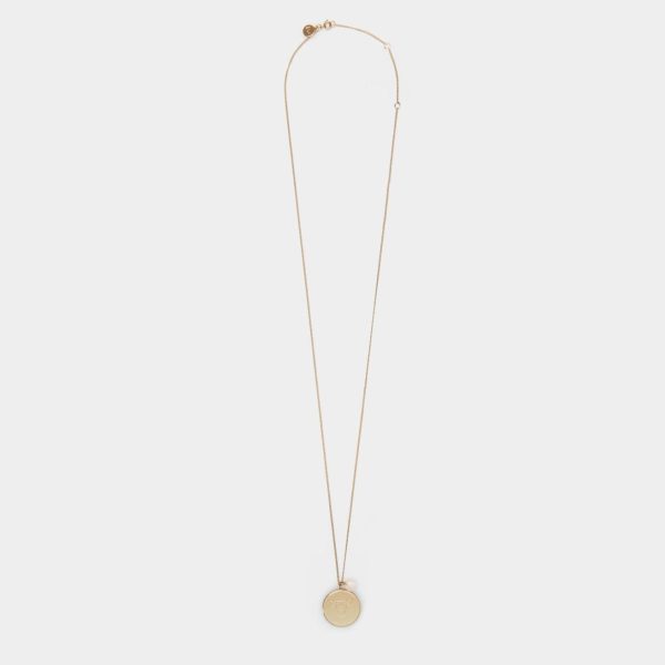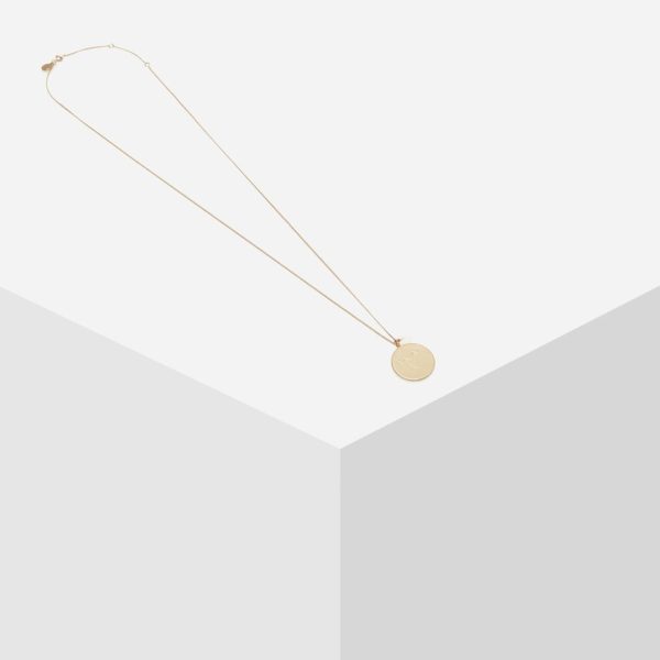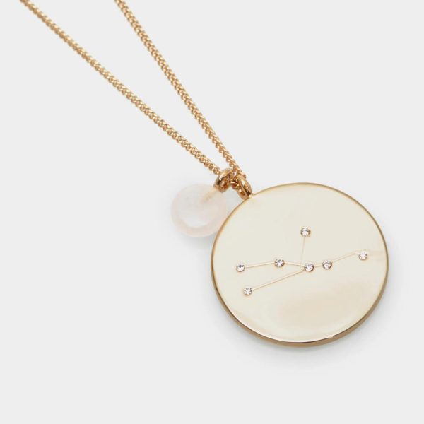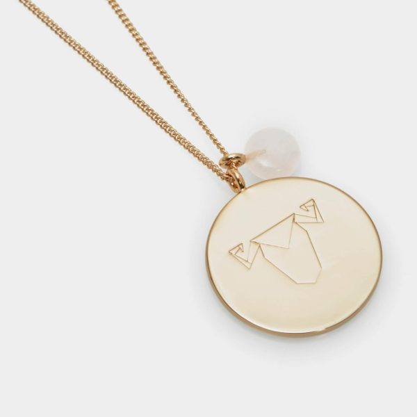 Collar fino bañado en oro con colgante grabado con símbolo y constelación Tauro. Detalle de incrustación de cristales y colgante de cuarzo.