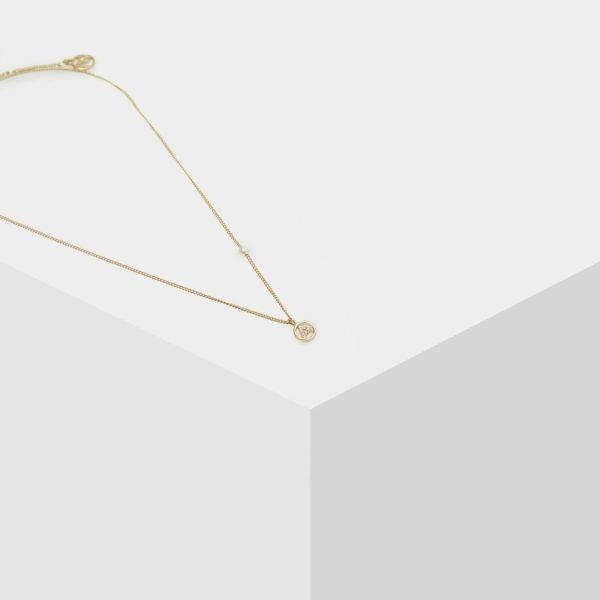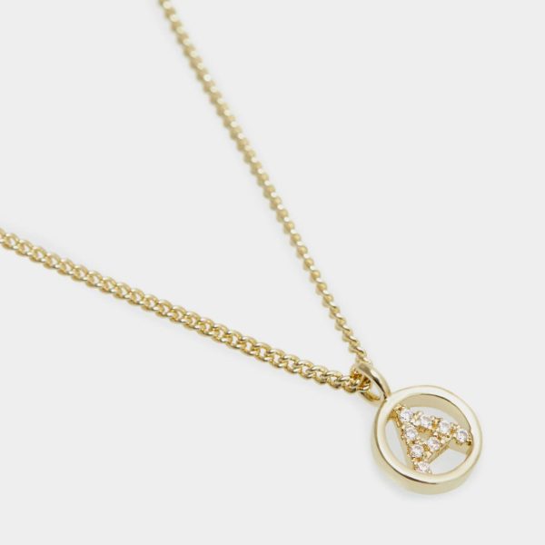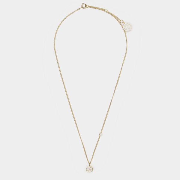 Collar fino bañado en oro con detalle de perla y colgante con letra A con incrustación de cristales.