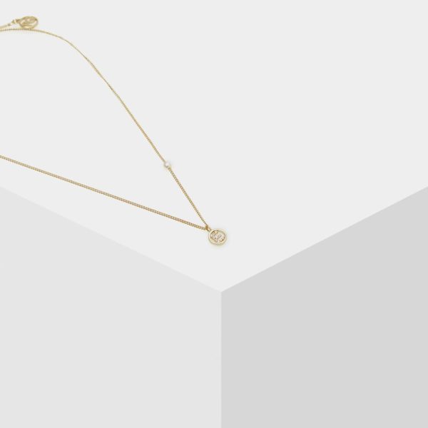 Collar fino bañado en oro con detalle de perla y colgante con letra E con incrustación de cristales.