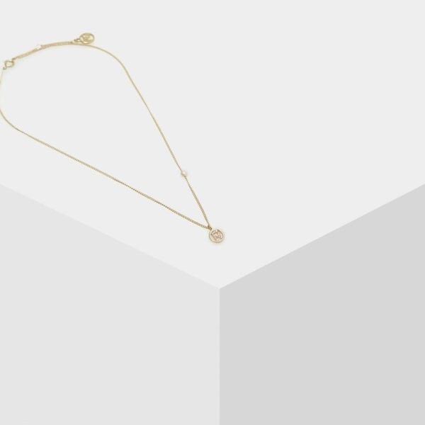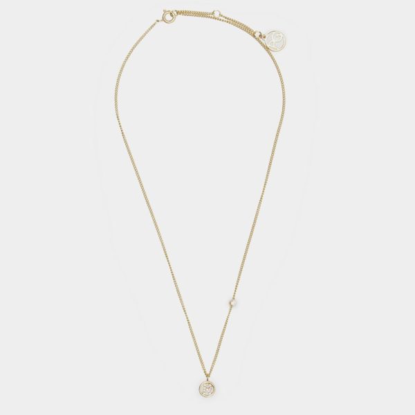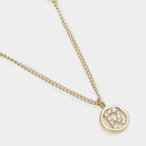 Collar fino bañado en oro con detalle de perla y colgante con letra R con incrustación de cristales.