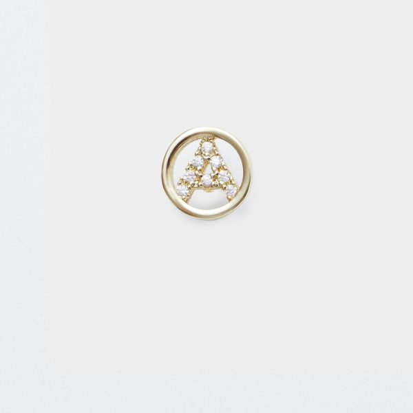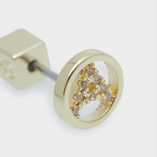 Pendiente individual bañados en oro con letra A con incrustación de cristales. Cierre con tuerca a presión en forma de cubo.