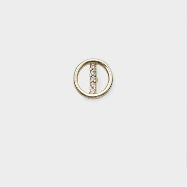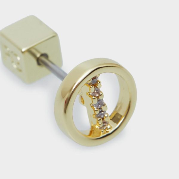 Pendiente individual bañados en oro con letra I con incrustación de cristales. Cierre con tuerca a presión en forma de cubo.