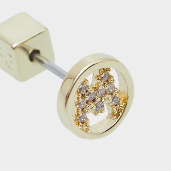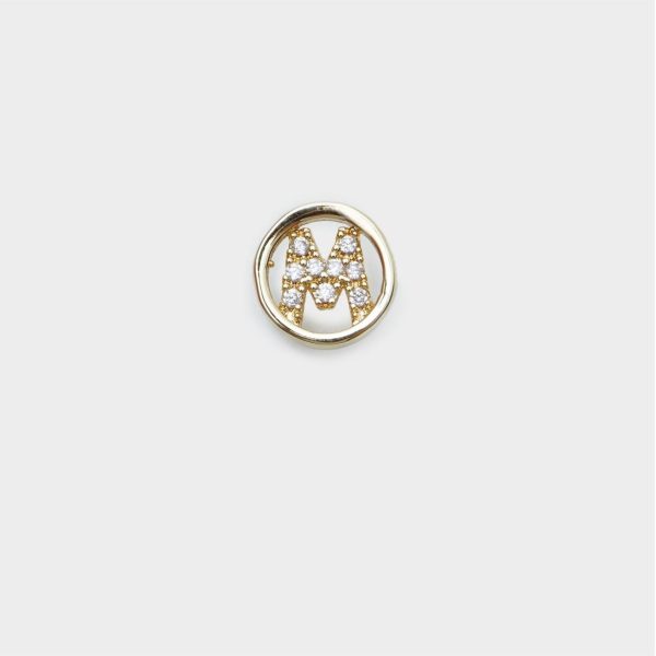 Pendiente individual bañados en oro con letra M con incrustación de cristales. Cierre con tuerca a presión en forma de cubo.