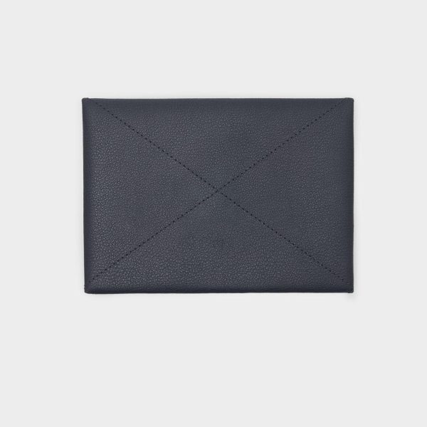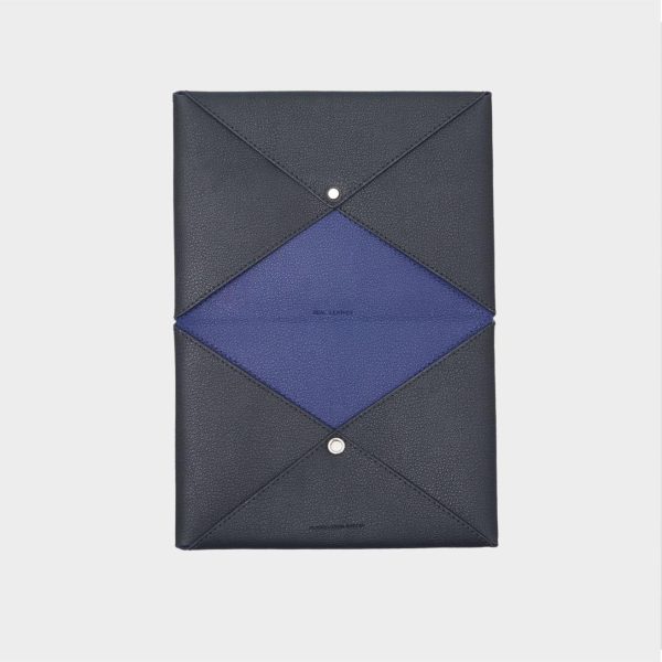 Pouch de piel con formato A5. Detalle de pespuntes y logo PG grabado. Cierre fold-over con botón a presión. Interior en piel a contraste.