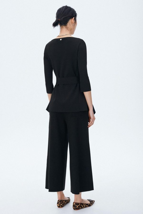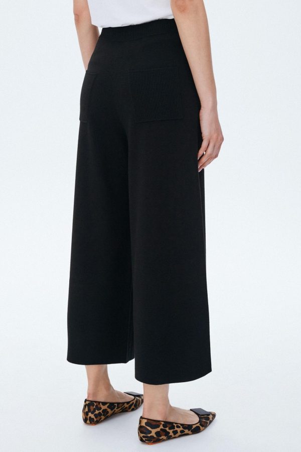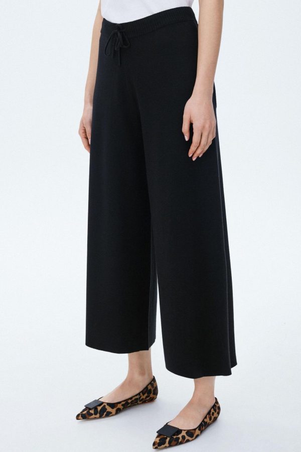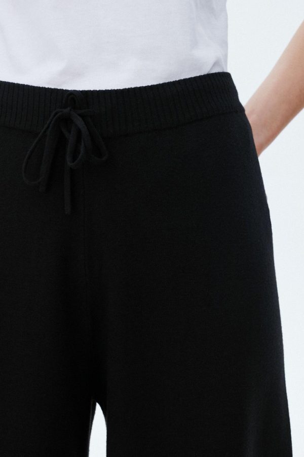 Pantalón fluido en punto stretch con bolsillos parche y cintura ajustable. Tiene jersey a conjunto. La modelo mide 180 cm y lleva una talla XS.