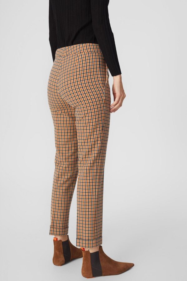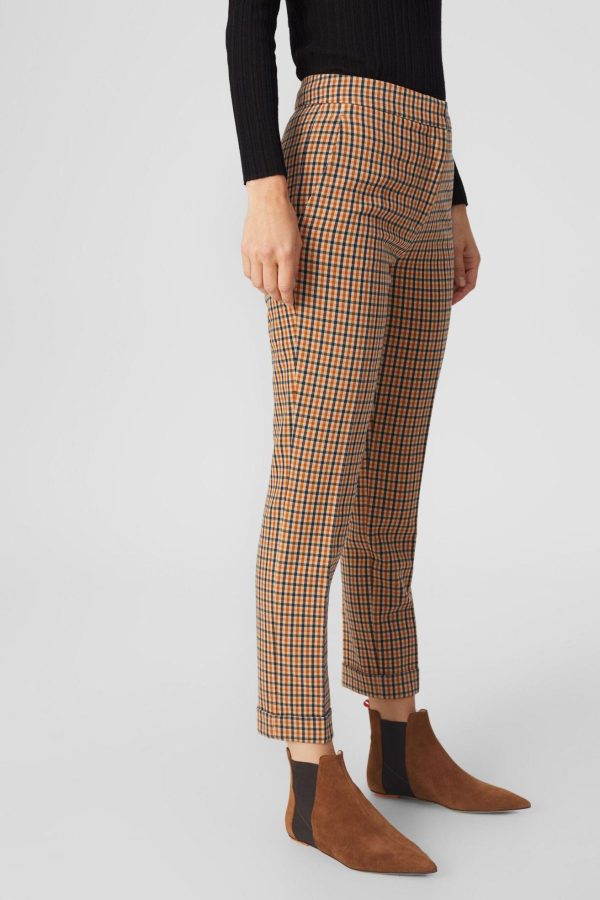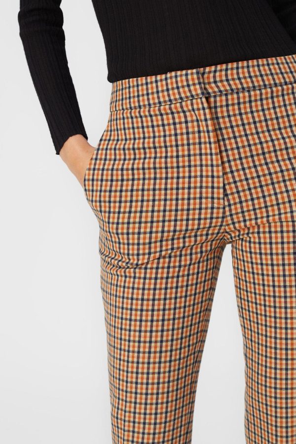 Pantalón pitillo en doble tela con estampado de cuadros. Bolsillo francés, dobladillo en el bajo y cierre oculto. La modelo mide 180 cm y lleva una talla 36.
