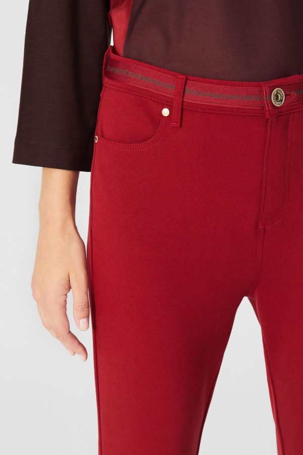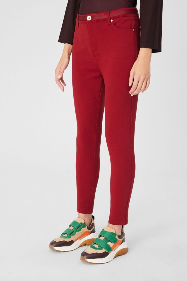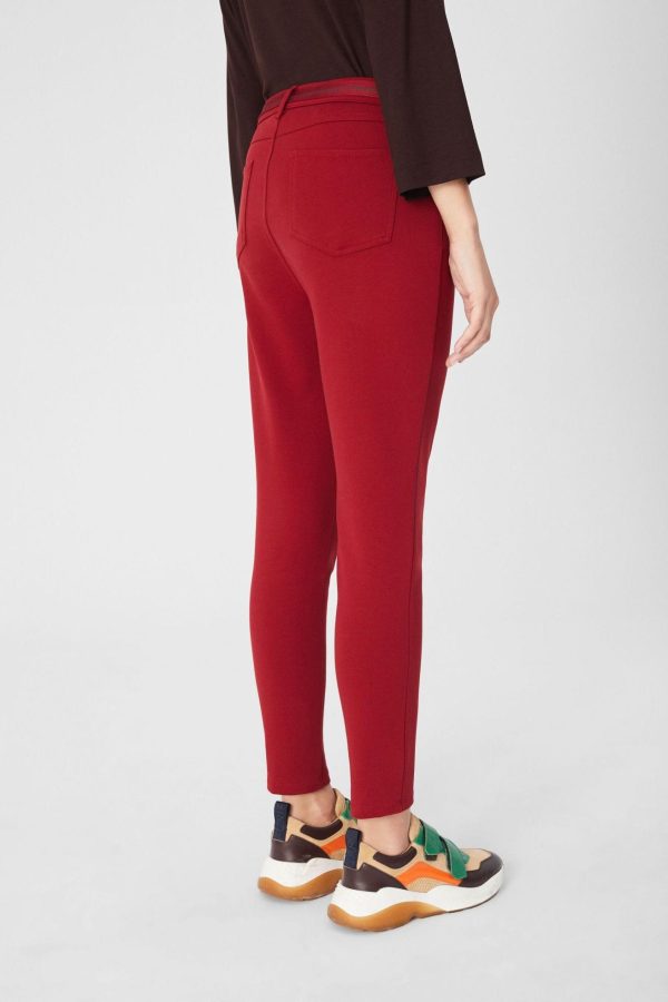 Pantalón pitillo en punto roma de algodón stretch. Diseño cinco bolsillos y cinta de grosgrain en la cintura. Cierre con cremallera oculta por tapeta y botón metálico. Detalle de tacha de piel en la espalda. La modelo mide 179 cm y lleva una talla 38.