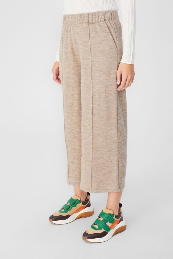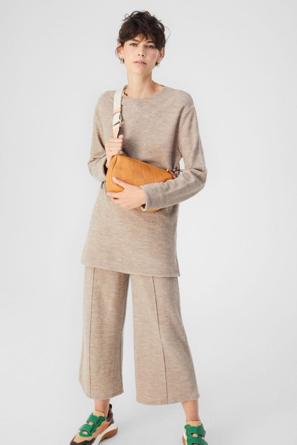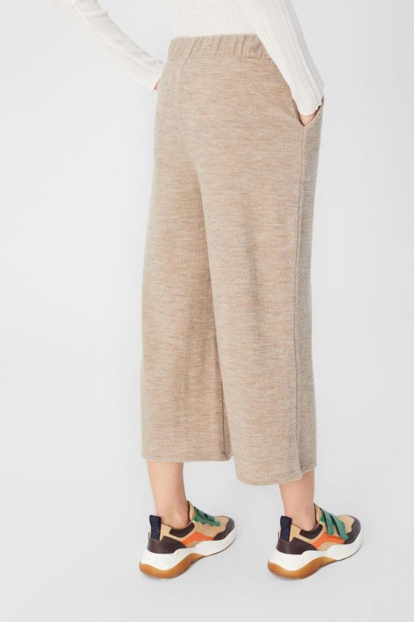 Pantalón amplio en punto de mezcla lana con cinturilla elástica. Dos bolsillos laterales y detalle de costura en delantero. Tiene jersey a conjunto. La modelo mide 179 cm y lleva una talla S.