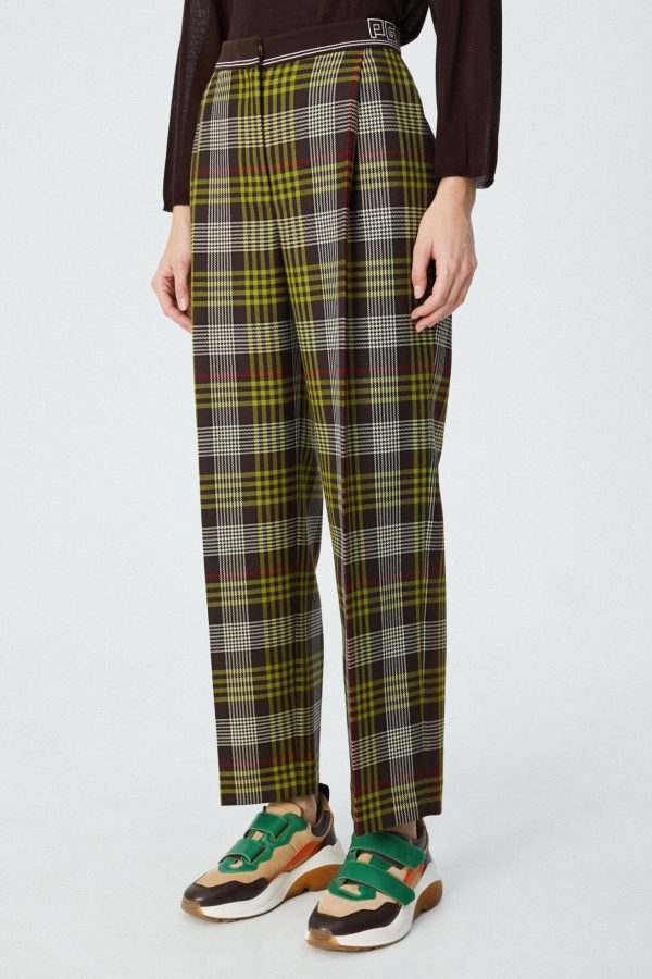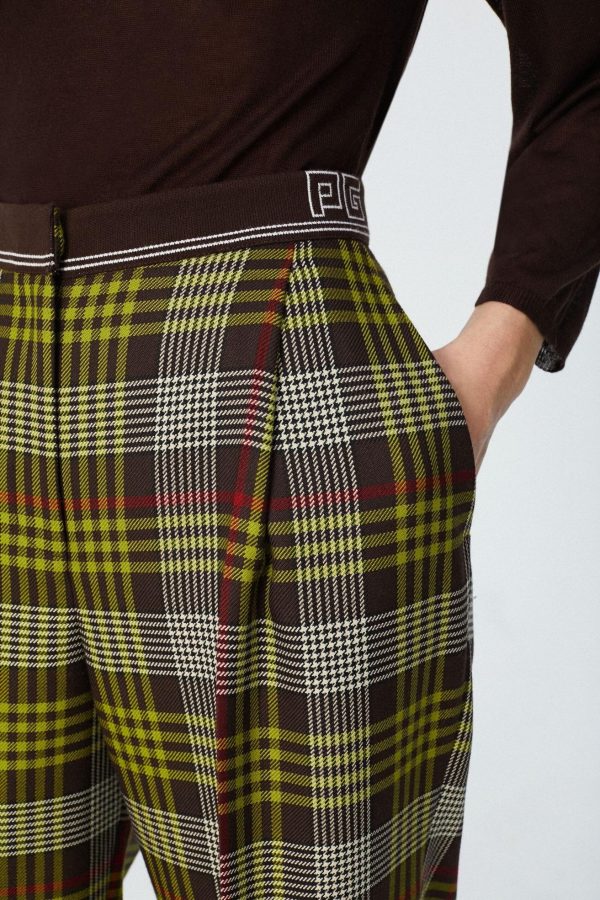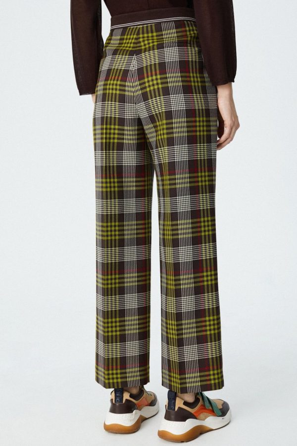 Pantalón recto amplio en mezcla de lana con diseño de cuadros. Bolsillos laterales y cinturilla elástica. La modelo mide 179 cm y lleva una talla 38.