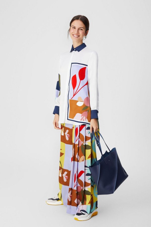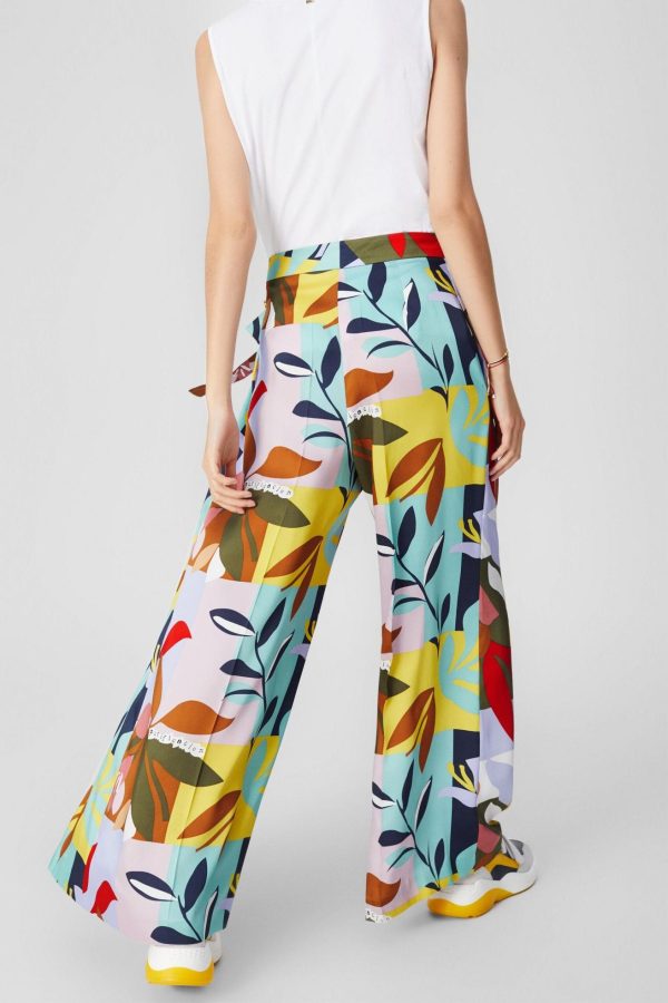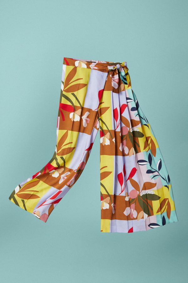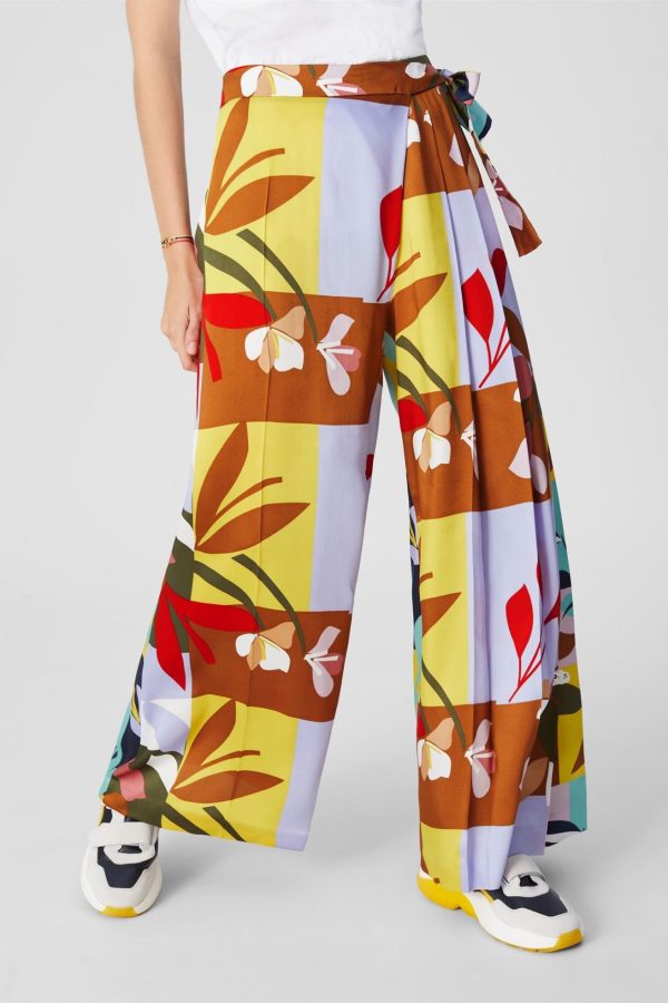 Pantalón palazzo en twill estampado con lateral plisado y cierre de lazada. La modelo mide 174 cm y lleva una talla 38.