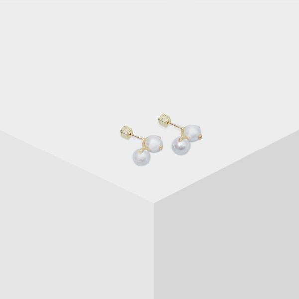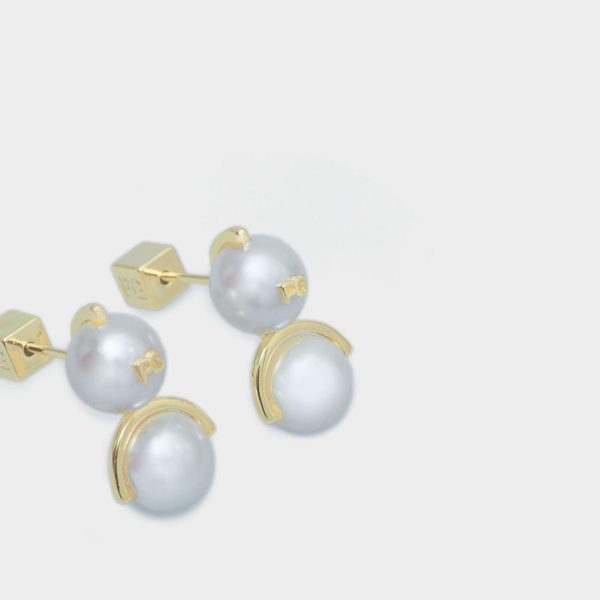 Pendientes bañados en oro con doble perla de cristal con logo PG. Cierre con tuerca a presión en forma de cubo en forma de cubo.