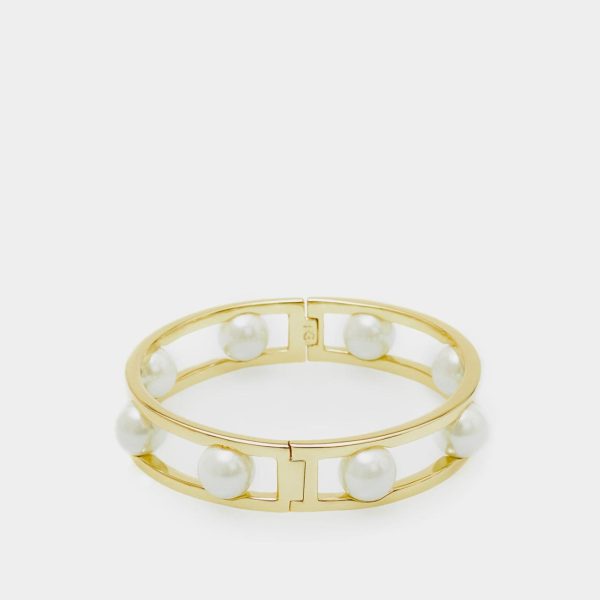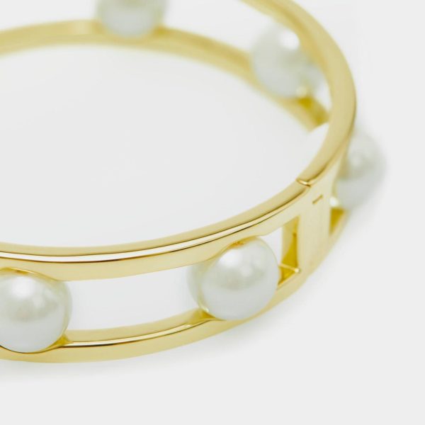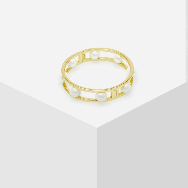 Pulsera rígida doble bañada en oro con perlas engarzadas entre ellas.