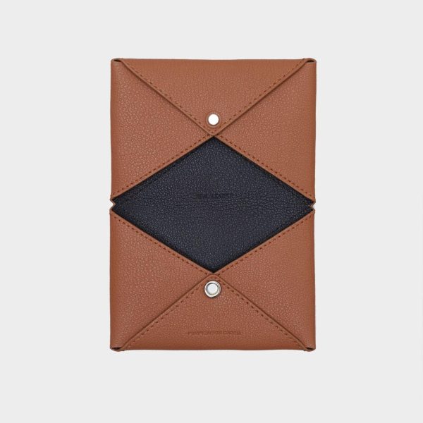 Funda de pasaporte en piel con dos compartimentos. Cierre con botones a presión e interior a contraste.