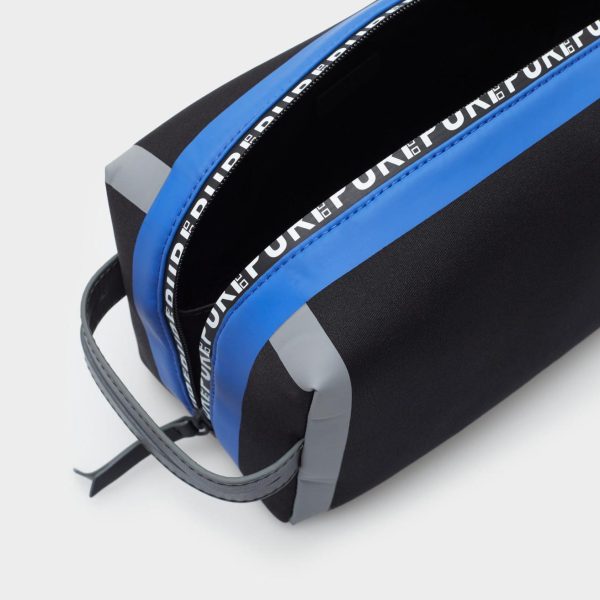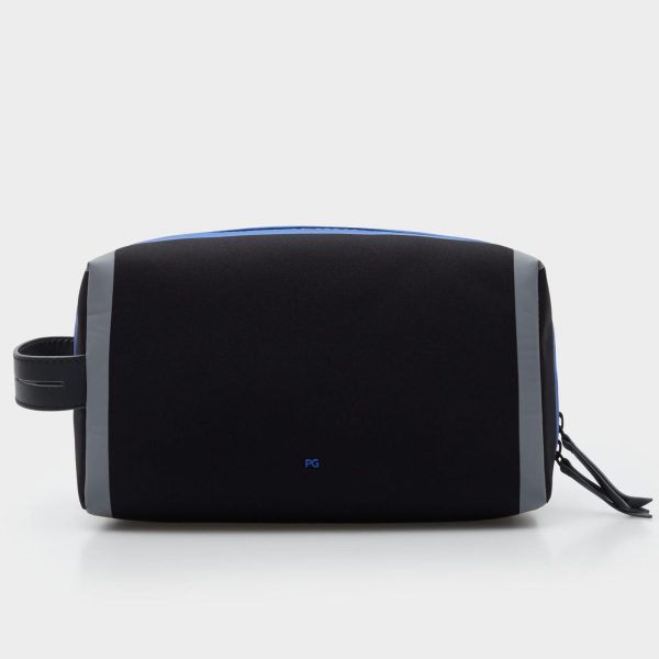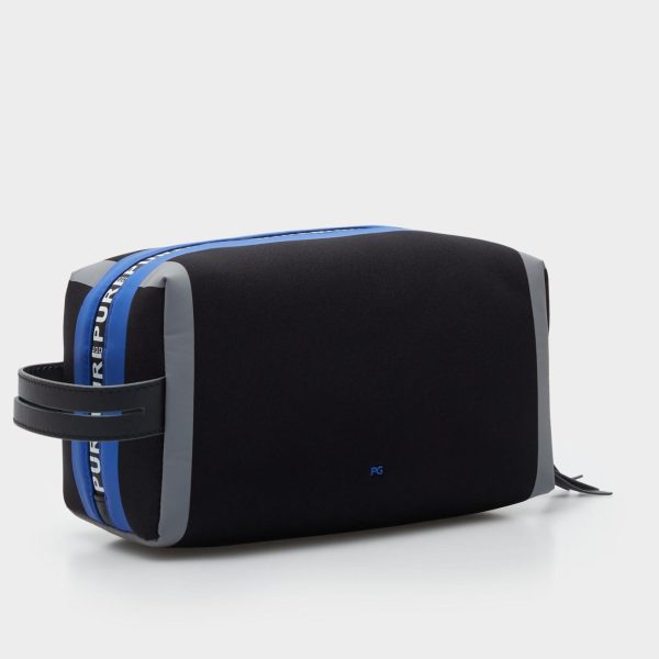 Neceser en neopreno con asa lateral en piel. Cierre de cremallera termosellada con logo PG y tirador en piel.