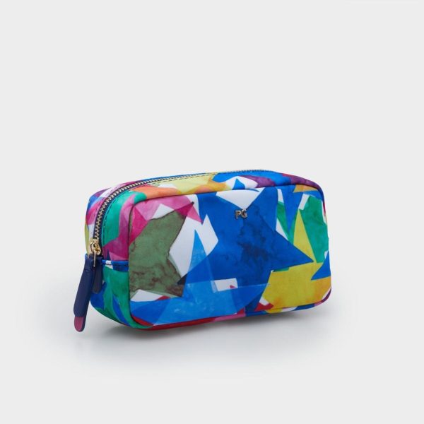 Neceser pequeño en nylon con estampado “Lluvia de estrellas” y metálicas PG. Cierre de cremallera con tirador en piel.