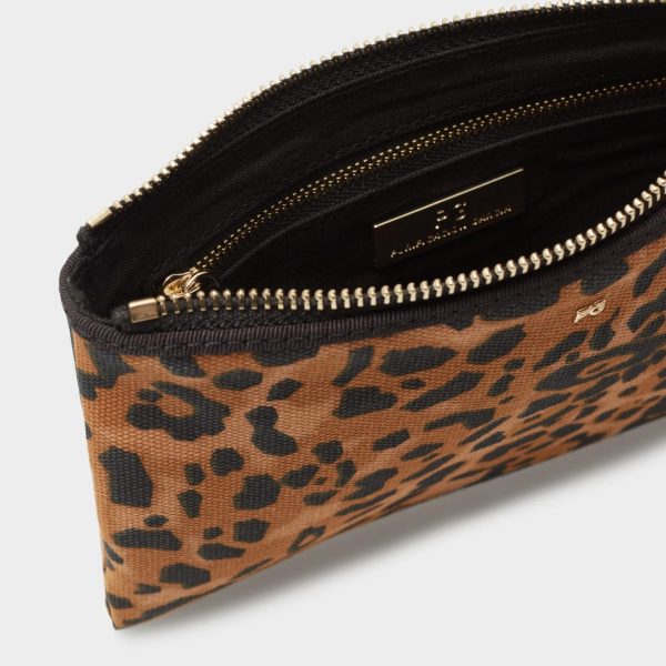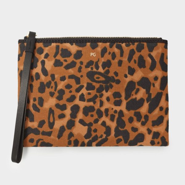 Pouch grande en canvas con estampado de leopardo y metálicas de logo PG. Cierre de cremallera con tirador en piel. Interior con forro completo y un bolsillo.