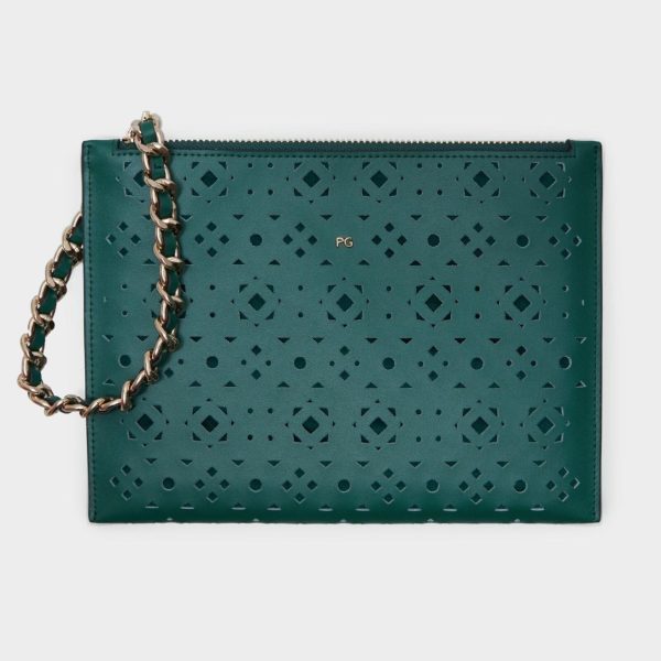 Pouch grande en piel troquelada con asa de cadena y piel trenzada. Cierre de cremallera e interior con forro completo.