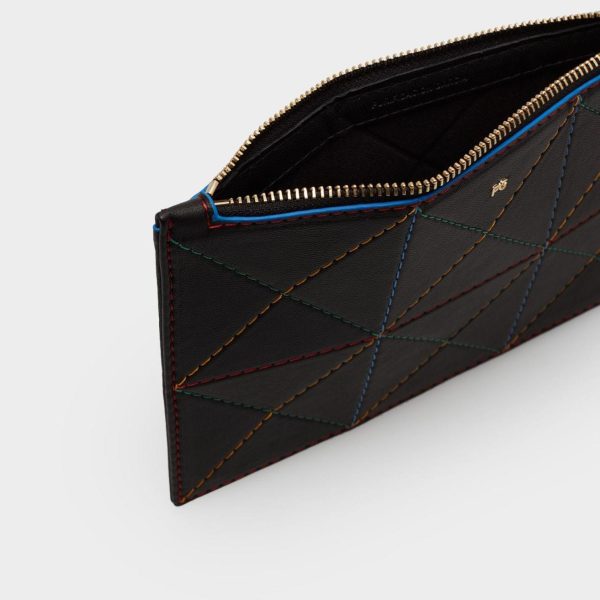 Pouch en piel de napa con diseño Origami y metálicas de logo PG. Detalle de pespuntes multicolor. Cierre de cremallera e interior con forro completo.