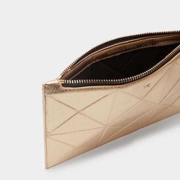 Pouch en piel de napa con diseño Origami y metálicas de logo PG. Cierre de cremallera e interior con forro completo.