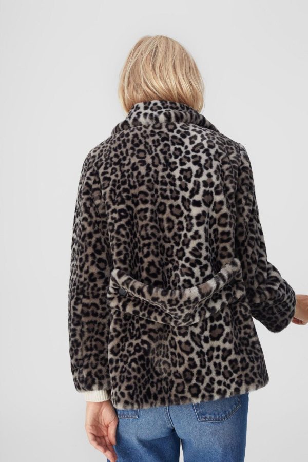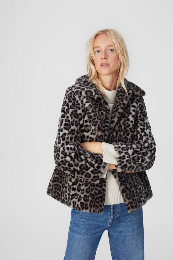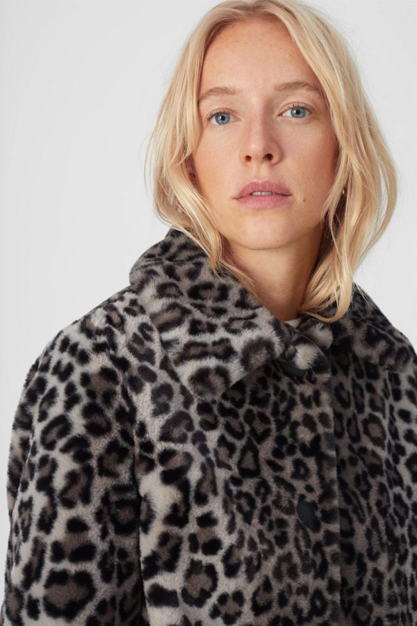 Chaquetón evasé con acabado efecto pelo de animal print. Cuello con solapa y cierre de botón delantero. La modelo mide 180 cm y lleva una talla S.