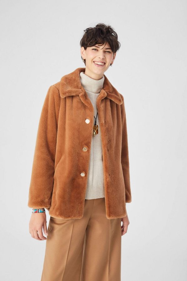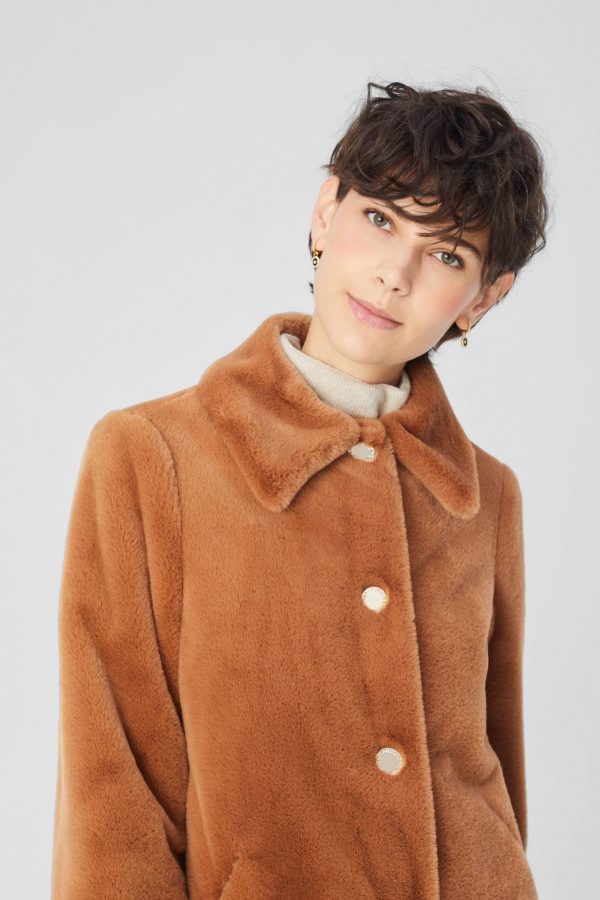 Chaquetón evasé con acabado efecto pelo liso. Cuello con solapa y cierre de botón delantero. La modelo mide 179 cm y lleva una talla S.