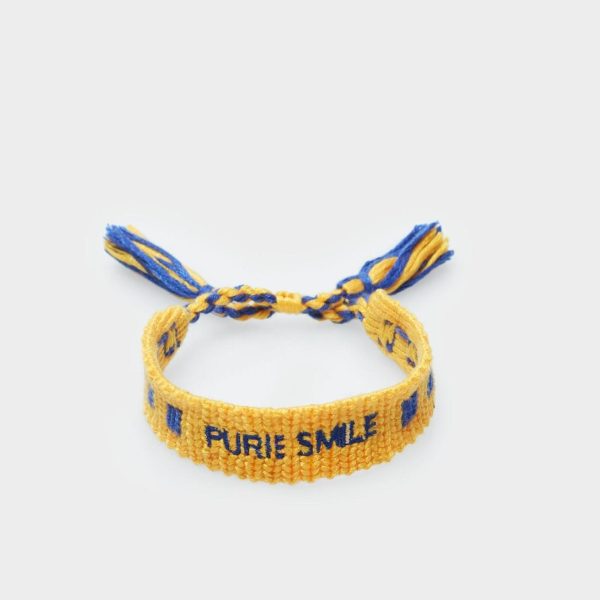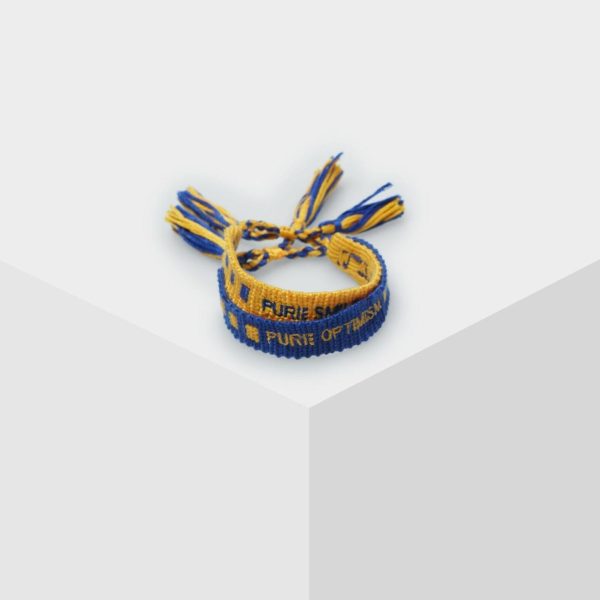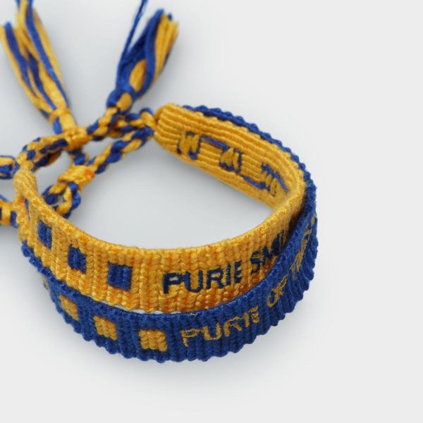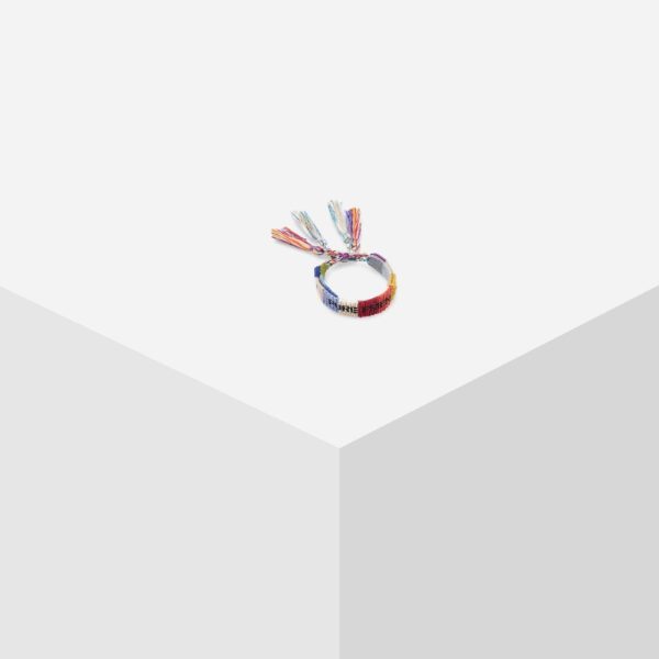 Juego de dos pulseras tejidas en hilo multicolor con grabado Puri Friends. Largo regulable.