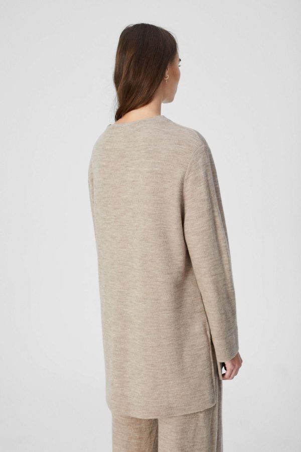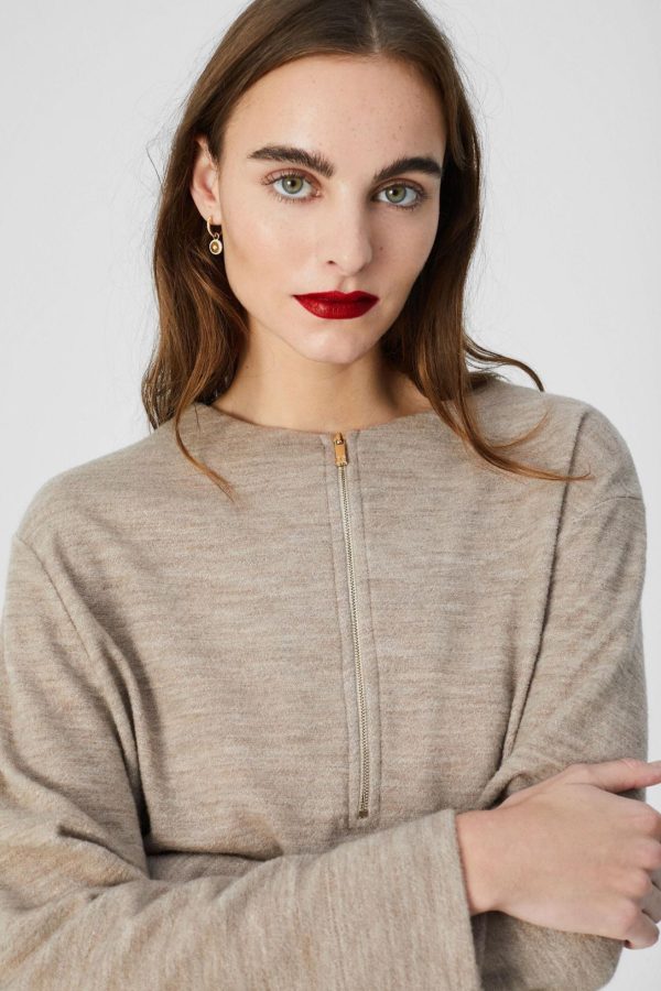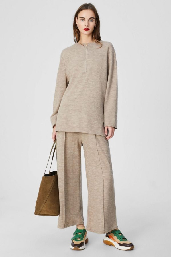 Jersey recto en mezcla lana con bajo asimétrico. Cuello redondo con cremallera. Tiene pantalón a conjunto. La modelo 179 cm y lleva una talla M.