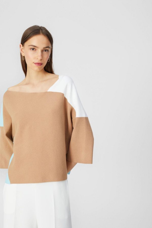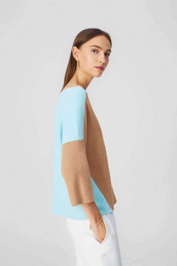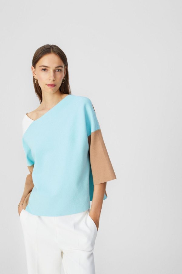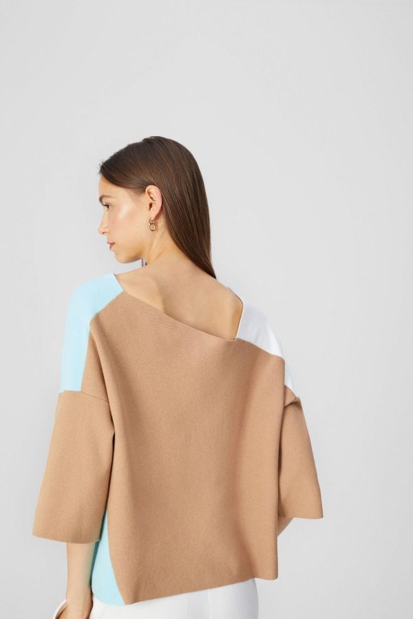 Jersey recto en punto stretch con diseño colorblock. Escote asimétrico en frente y espalda, manga tres cuartos. La modelo mide 180 cm y lleva una talla M.