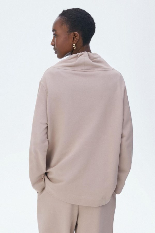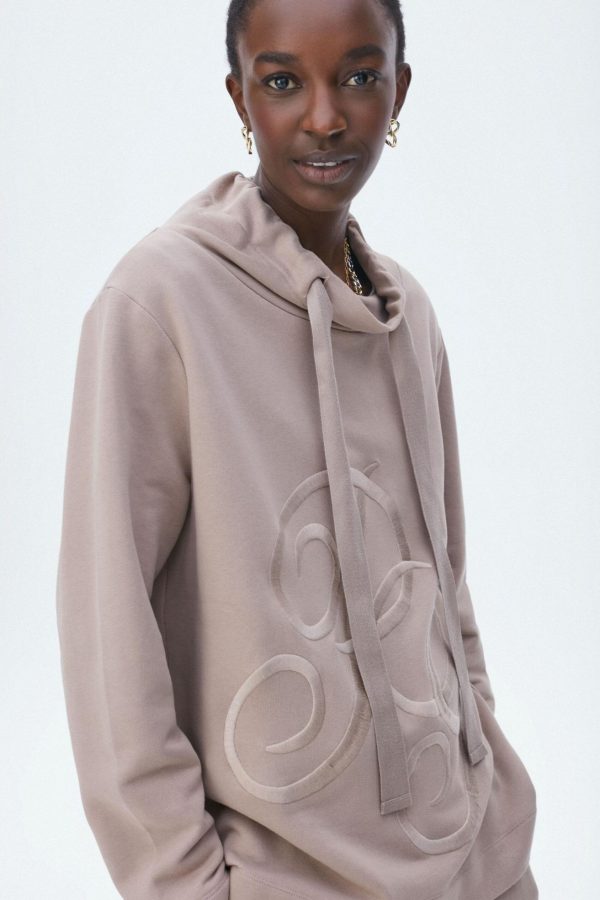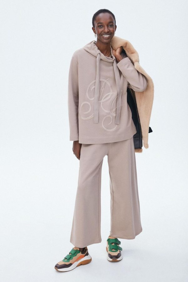 Sudadera recta en felpa stretch con bordado de PG a tono. Cuello chimenea con fruncidores. Tiene pantalón a conjunto. La modelo mide 176 cm y lleva una talla S.