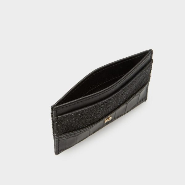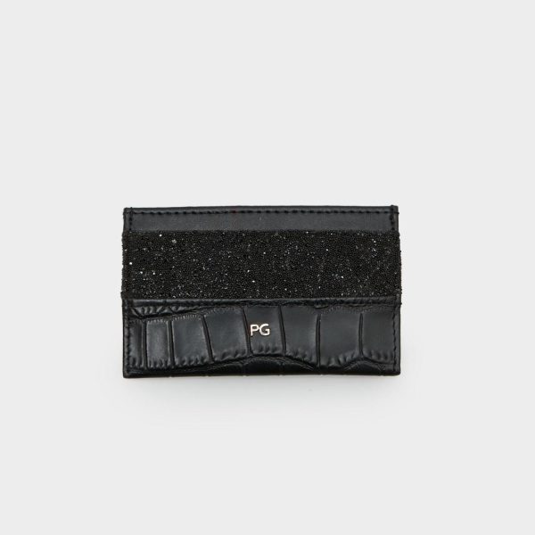 Tarjetero en patchwork de piel con apliques de abalarios a tono. Dos ranuras para tarjetas y compartimento central.