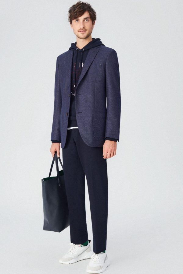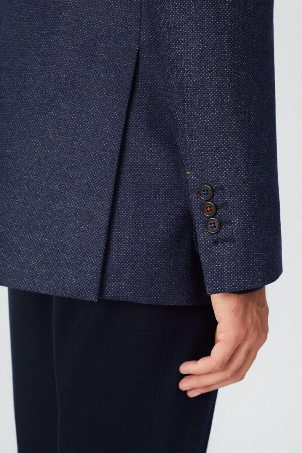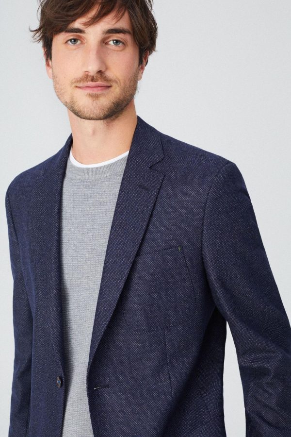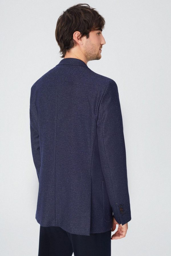Chaqueta clásica en estructura de mezcla lana con cashmere. Diseño dos botones con tres bolsillos parche y aberturas laterales. Sin hombrera ni forro en espalda. Detalle de botones con hilo a contraste. Cubo PG bordado en el pie de cuello y pin en la solapa. El modelo mide 187 cm y lleva una talla 48.