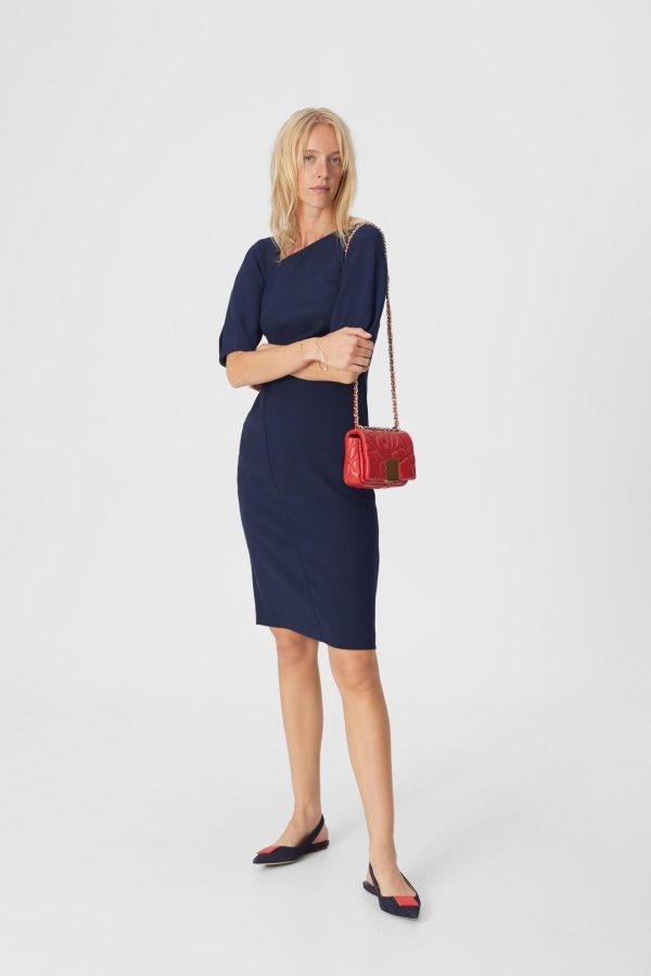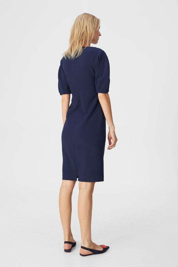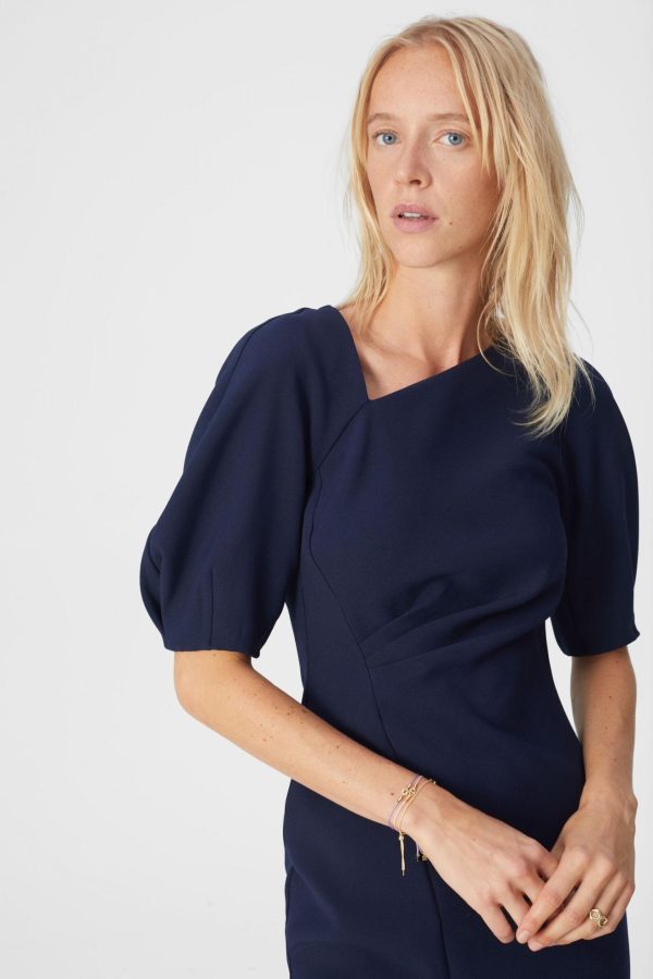 Vestido tubo en tejido de doble tela con drapeado en delantero. Manga abullonada y escote asimétrico. La modelo mide 180 cm y lleva una talla 38.