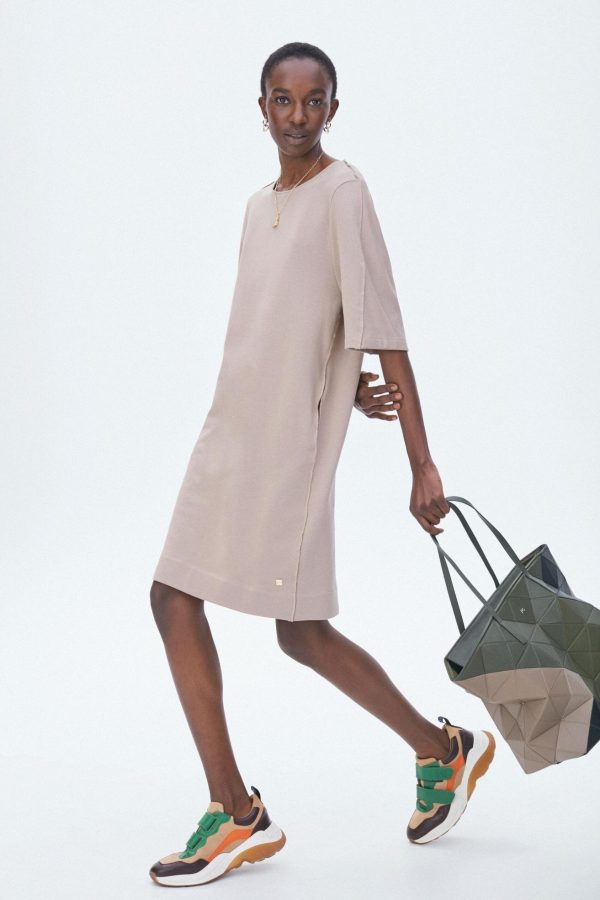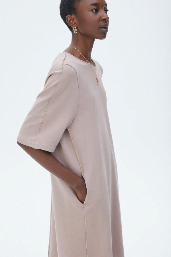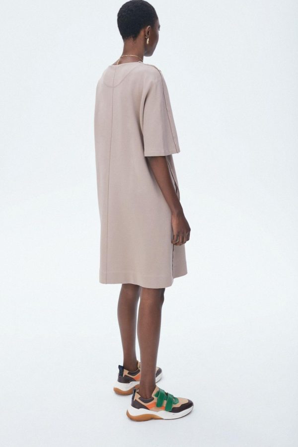Vestido de felpa de algodón con cuello redondo y manga tres cuartos. La modelo mide 176 cm y lleva una talla 36.