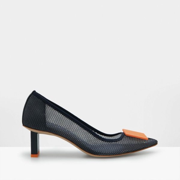 Zapato de tacón en rejilla con chapón en forma de cubo a contraste. Suela en piel y plantilla de piel a contraste.